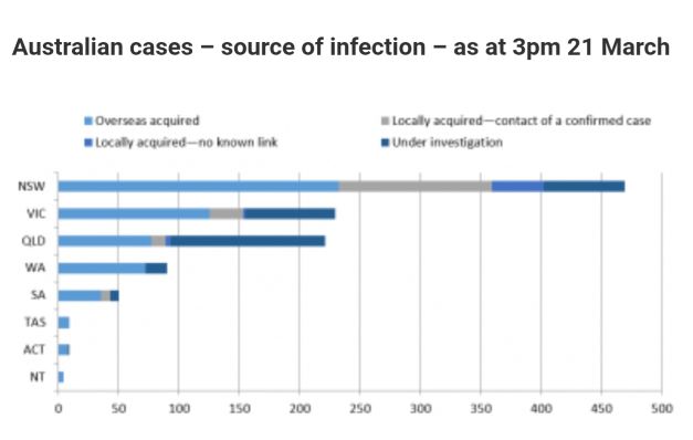 According to WHO situation reports, on 19 March Australia reported 199 new cases, an increase of 39% to 709. On 20 March that increased another 164 to 873. And on 21 March the latest reported number of cases stood at 1,081. So within 3 days the number of cases more than doubled from 510 to 1,081. And remember – remember! – that the Government strict rules on who can be tested precludes people being tested unless they have travelled overseas or had contact with a confirmed case in the previous 14 days (though on Friday it was broadened to allow testing of people in aged care facilities).