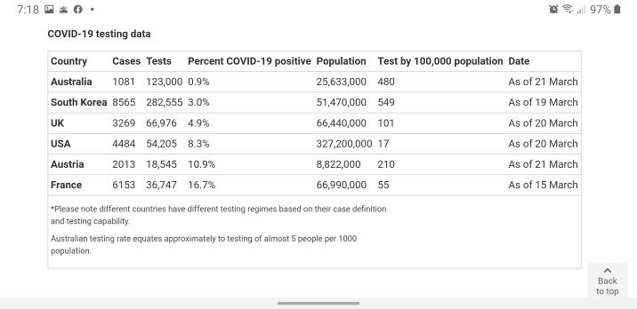 But look at the note on the table “different countries have different testing regimes based on their case definition and testing capability”. In Australia it remains the case that in order to be tested the patient either needed to have travelled overseas or had known contact with an infected person, and only last Friday was it extended to include people from nursing homes irrespective of fitting the other criteria.