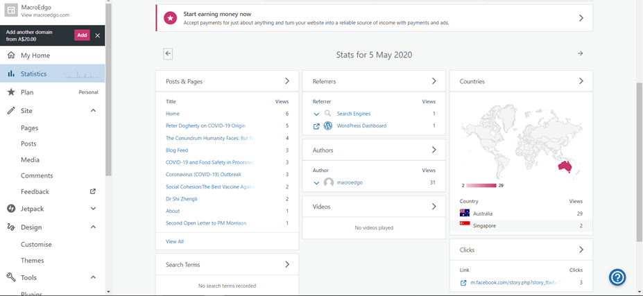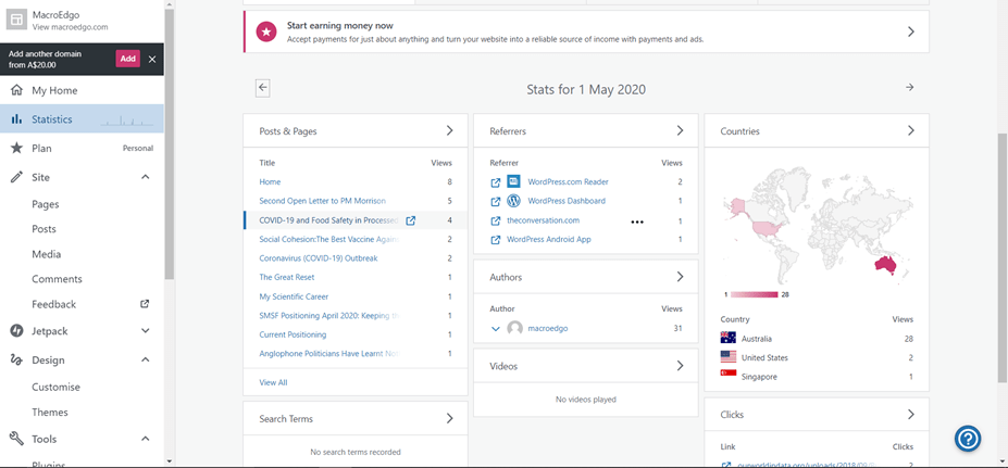 It was not until later that I began to think about how I had a reader from Singapore looking around my site some time back, who had not visited again since. When I looked through the viewing logs for my site I saw that they had visited on 1 May and again on 5 May looking at several pages, when I had just released my report on the potential for contaminated meat to spread SARS-CoV-2, “COVID-19 and Food Safety“, and when I had been active in promoting my concerns over this potential including writing comments on “The Conversation” and open letters to politicians.