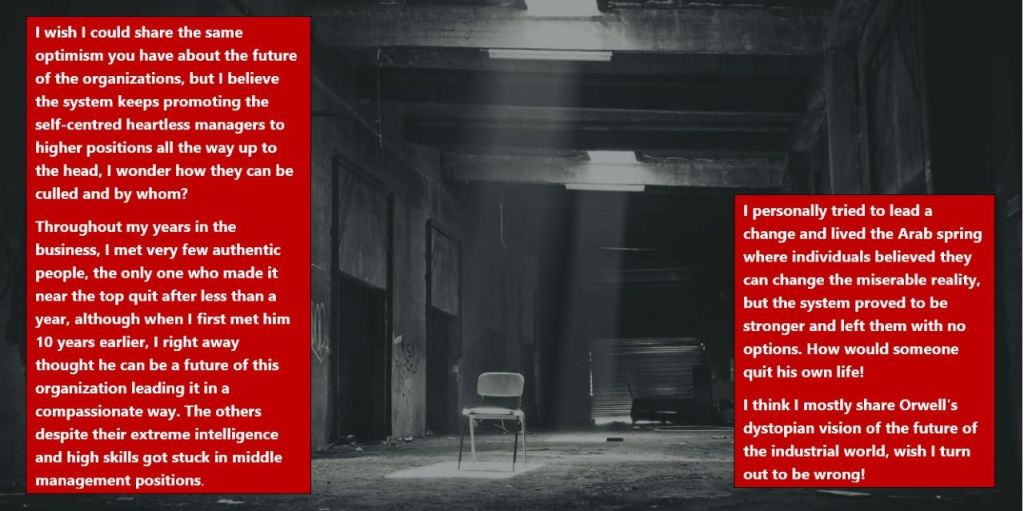 On the other hand, the owners will increasingly insist that they receive the dividend for their investments in technological innovation rather than them getting trapped within the organisation and being paid out disproportionately to the self-interest aggressive types at the top and rising through the hierarchy. They will realise that it is a better return for them when the business is run by co-operative types who are engaged, and who can lead all employees to be engaged, with the overall aims of the organisation.