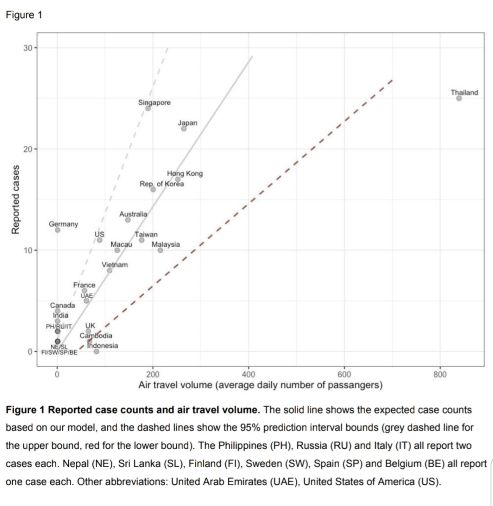 Unsurprisingly that included movement between the city at the centre of the initial outbreak, Wuhan, and broader Japan as can be seen in the figure below taken from an early paper by Salazar et al (2020), epidemiological researchers out of the Harvard TH Chan School of Public Health, which looked at the number of reported cases relative to the volume of air travel between that country and Wuhan. Now the case data, of course, is well out of date, as the epidemic is moving so quickly, but what I really want the reader to note is the X axis which shows the average daily number of passengers travelling from Wuhan to other countries. Note that Thailand receives by far the greatest volume of passengers from Wuhan, but Japan is second.